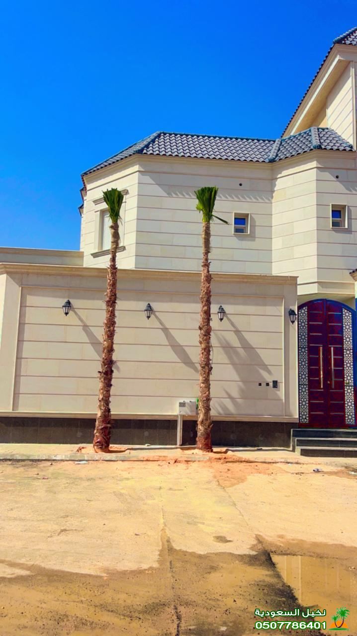 - حدائق فلل في حي الياسمين: تنسيق وتصميم مع نخيل سكري وأشجار زيتون، مع صيانة دورية.